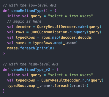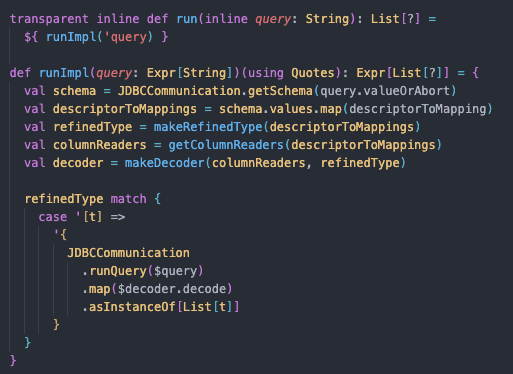 Normally, we need ORM libraries or magical stuff like Doobie or Quill to be able to map database types to our data model that we write manually. This project is an experiment: what if we skipped all that and synthesized types automatically with the right fields before the code is even compiled?